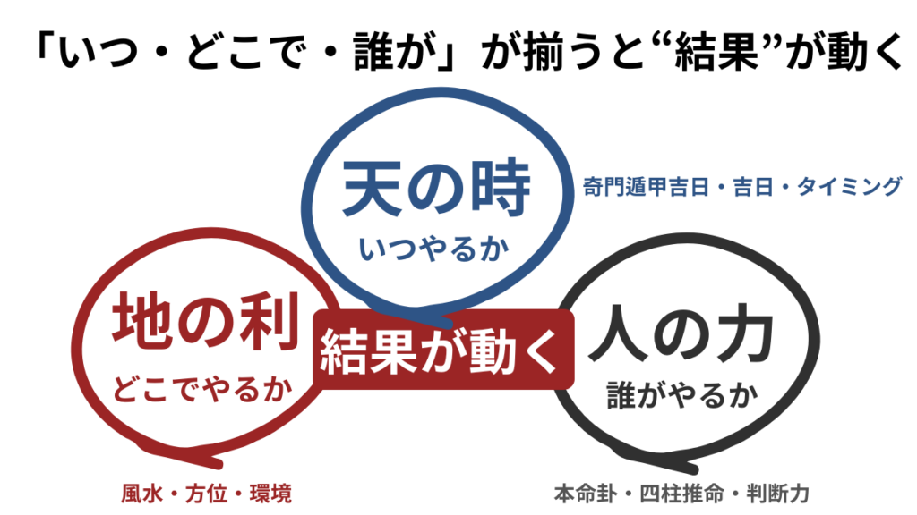 本命卦(個人の風水方位)や命式(四柱推命による個人の運勢)などを通して、自分に合う環境や流れを知ることが大切です。