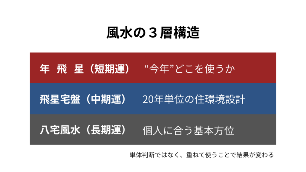 この3つを重ねて見ることで、風水は「なんとなくの開運」ではなく、現実的に使える環境設計になります。