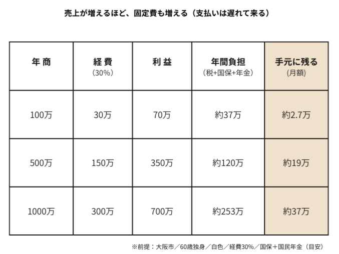 ここでは、イメージしやすいように、年商100万/500万/1000万円で「手残り」がどうなるかを、ざっくり比較表にしてみました。
