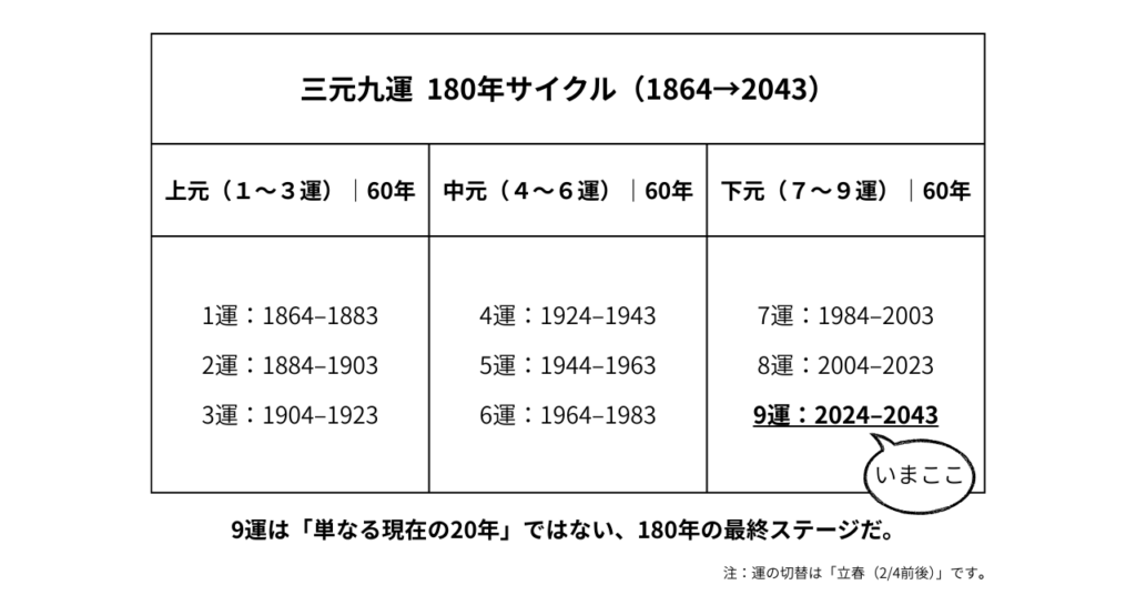 20年ごとに“運”が切り替わり、9つの運で180年が一巡します。